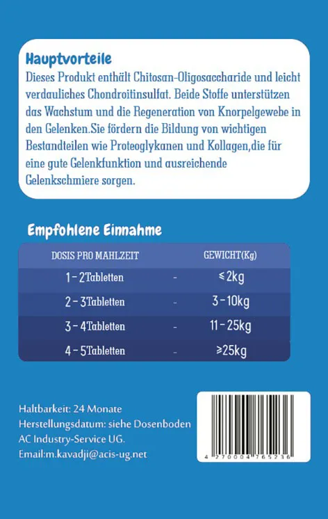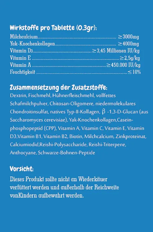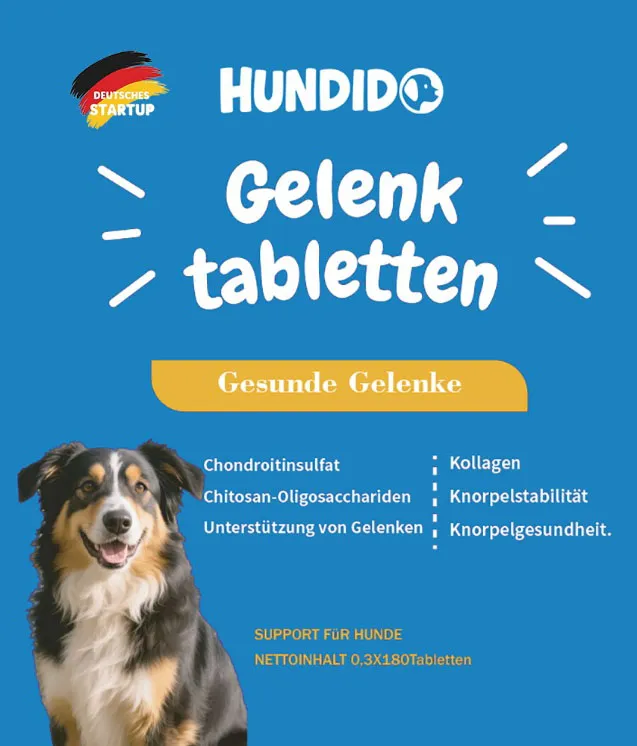 Unsere Gelenktabletten für Hunde wurden speziell entwickelt, um Gelenke, Knochen und Bänder nachhaltig zu unterstützen. Die einzigartige Kombination aus Kollagen, Chitosan-Oligosacchariden, Milchcalcium, Chondroitinsulfat sowie wertvollen Vitaminen und Mineralstoffen liefert alles, was Ihr Hund für starke Gelenke und uneingeschränkte Beweglichkeit braucht.