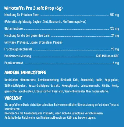 Die Drops sind getreide- und zuckerfrei, enthalten keine künstlichen Aromen oder Farbstoffe und sind somit auch für empfindliche Hunde bestens geeignet. Durch die weiche, leckere Konsistenz und dem natürlichen Geschmack werden sie von fast allen Hunden problemlos angenommen.